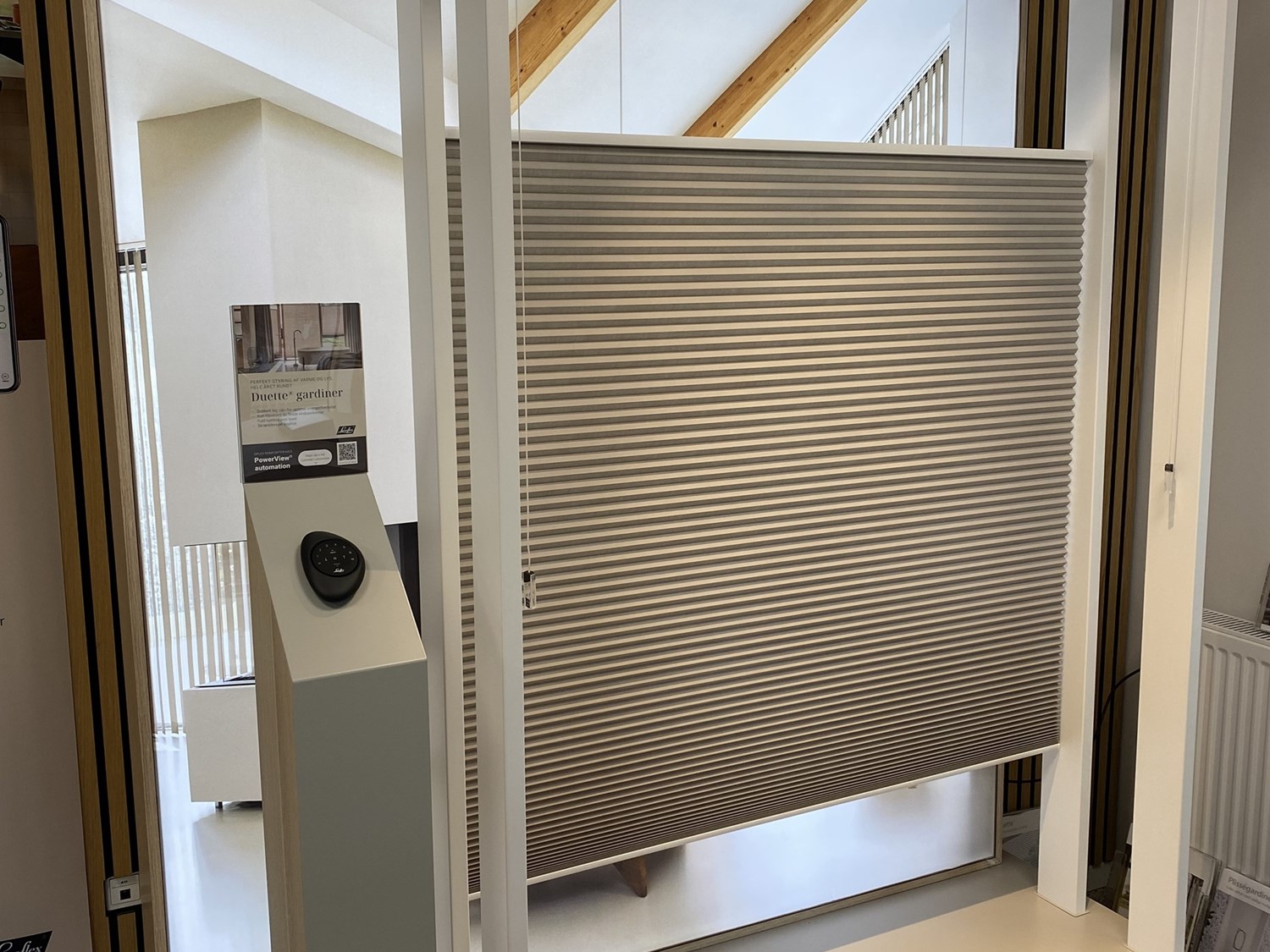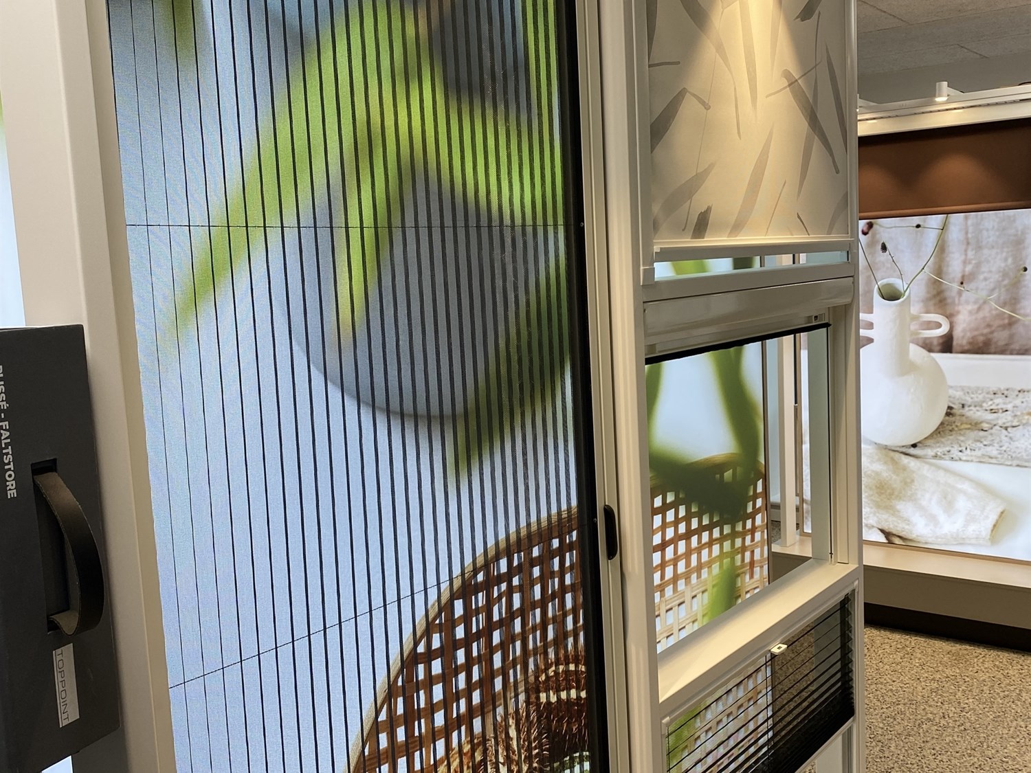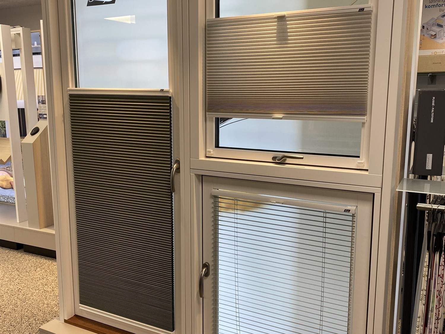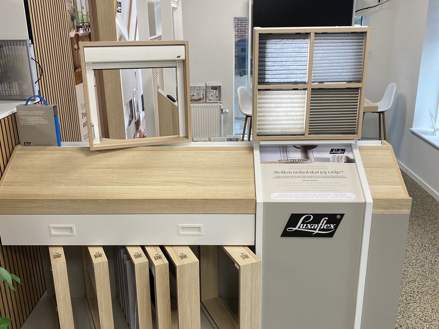 Til udeafdelingen er der prøver af markiser, hvis sommeren skal nydes i skyggen, eller screenduge til dæmpning af temperaturen i huset.